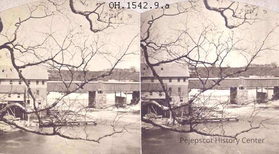 A B/W stereo view of Pejepscot Paper Co. showing the Pulp Mill and Old Bridge, Brunswick/Topsham, ME. The bridge is covered. It shows the Androscoggin River and appears to have been taken from The Brunswick side. Undated