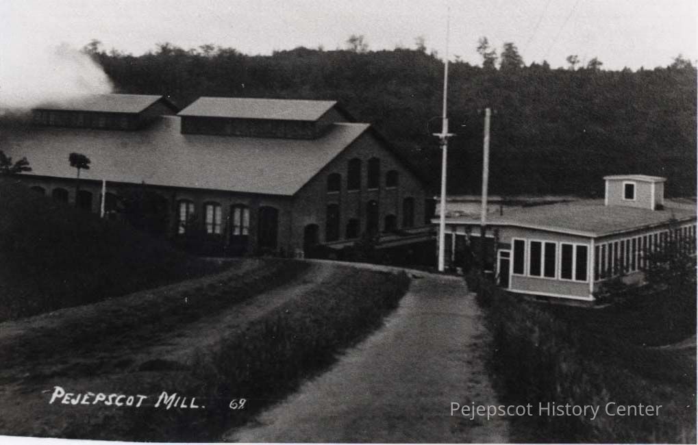 An undated black and white photograph of the Pejepscot Paper Company Mill. On the photograph are the words "Pejepscot Mill. 68."