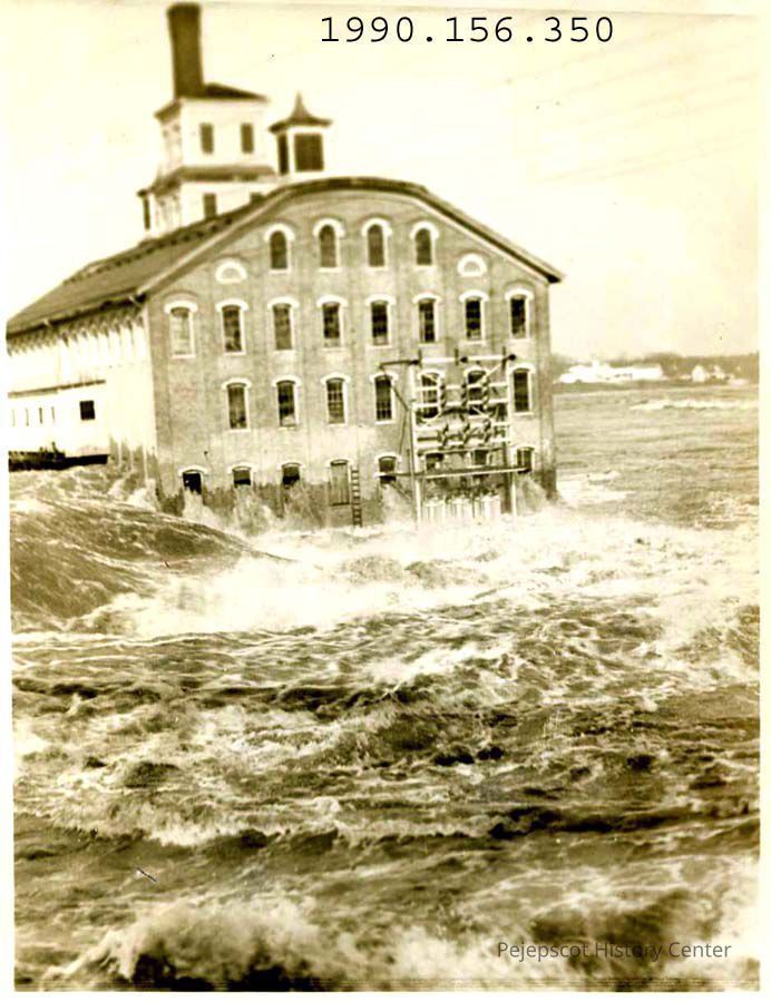 A B/W photograph of water pouring out the windows of the Pejepscot Paper Mill in Topsham during the Great Flood, March 1936.