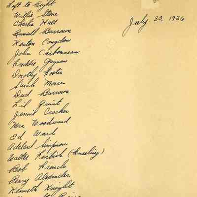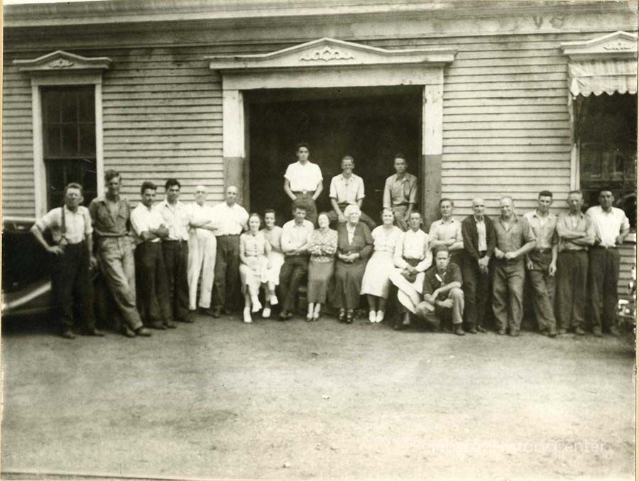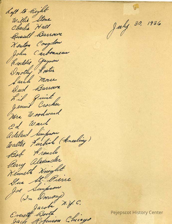 A B/W photo of the employees of the Pejepscot Paper Mill in Topsham, Maine, taken on July 30, 1936. All persons are identified on the back.
