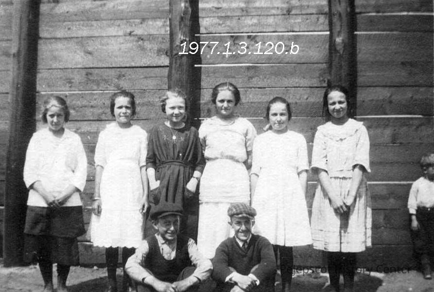 A B/W photograph of Pejepscot School Pupils. The fourth girl from the left in the back row is Anna Sheloski. Undated