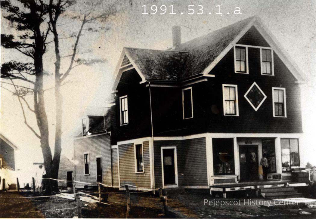 A black and white photograph of the Pejepscot Village General Store located in Pejepscot Village, a small village within the town of Topsham, Maine.