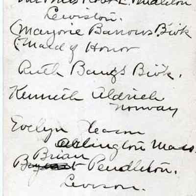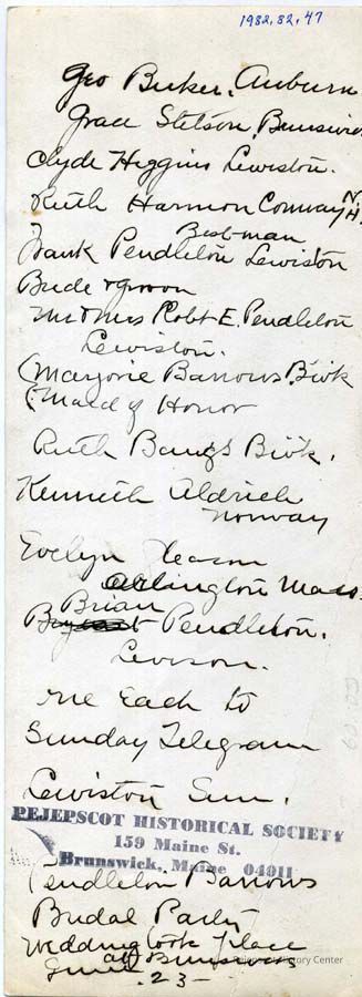 Black & white unmounted photograph of a wedding party ca 1930s. Written on back: "Geo. Buker, Auburn/Grace Stetson, Brunswick/Clyde Higgins, Lewiston/Ruth Harman, Conway NH/Best Man Frank Pendleton, Lewiston/Bride & Groom Mr. & Mrs. Robert E. Pendleton, Lewiston/Marjorie Barrows, Brunswick (Maid of Honor)/Ruth Bangs, Brunswick/Kenneth Aldrich, Norway/Evelyn Gleason, Arlington MA/Brian Pendleton, Lewiston." "One each to Sunday Telegram, Lewiston Sun". "Pendleton Barrows Bridal Party. Wedding took place at Brunswick June 23."Collection