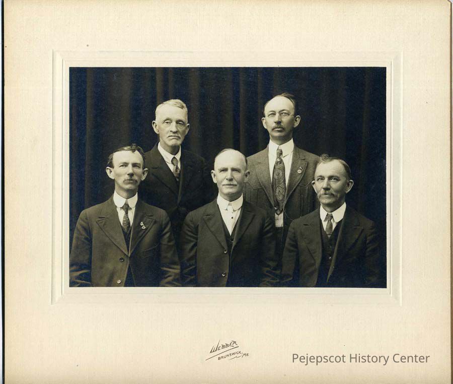 Black & white photograph of 5 men, identified on back as