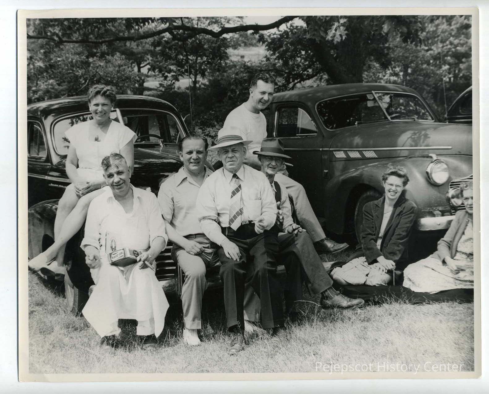 A group pf people sitting on a car at the Verney Mill picnic. Left to right the people pictured are Louise Atwood, Charlie Atwood, ?, ?, Ben Atwood, Horace Atwood, ? , and Mrs. Ben Atwood. UndatedLexicon