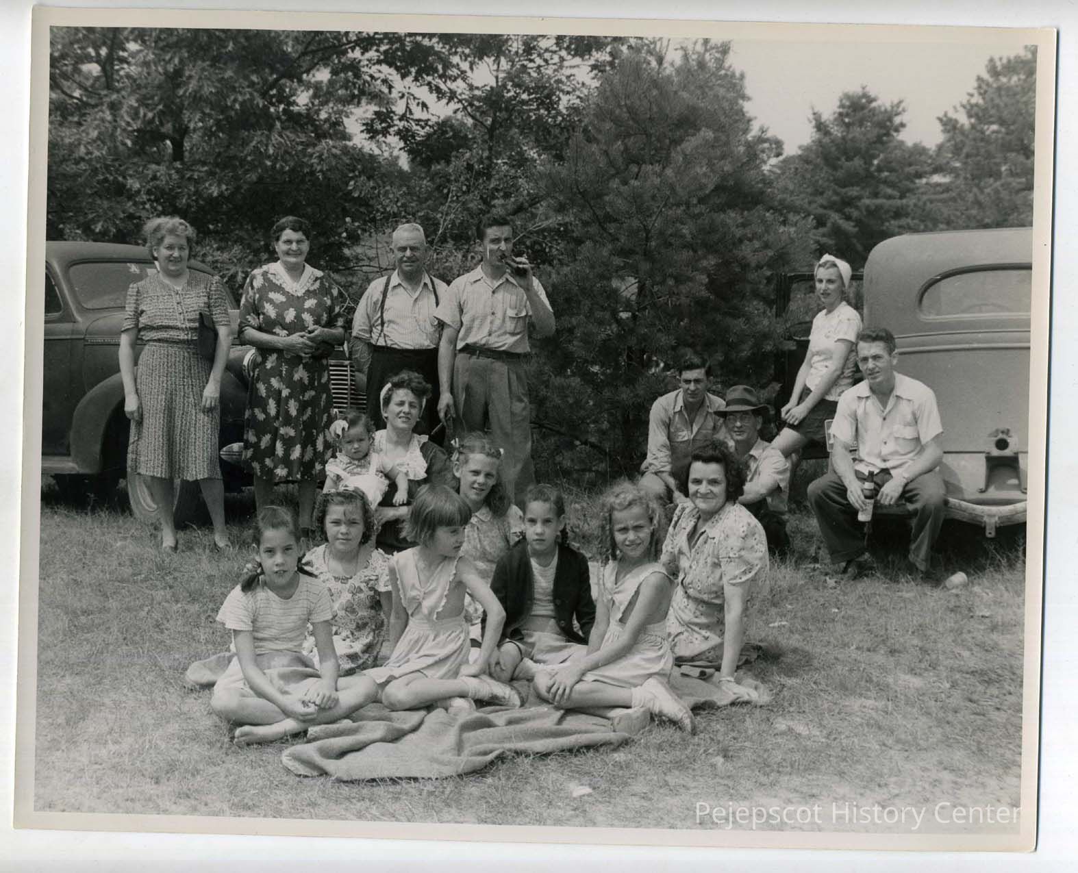 People sitting on the grass and leaning against cars at the Verney Mill picnic at Thomas Point Beach. Not all of the people are fully identified. Standing in the back are three people identified as Mr. and Mrs. Michaud and as Adrien Michaud parent. Seated there are two Michauds and two people identified only as Evan's and Louise's parents. Undated