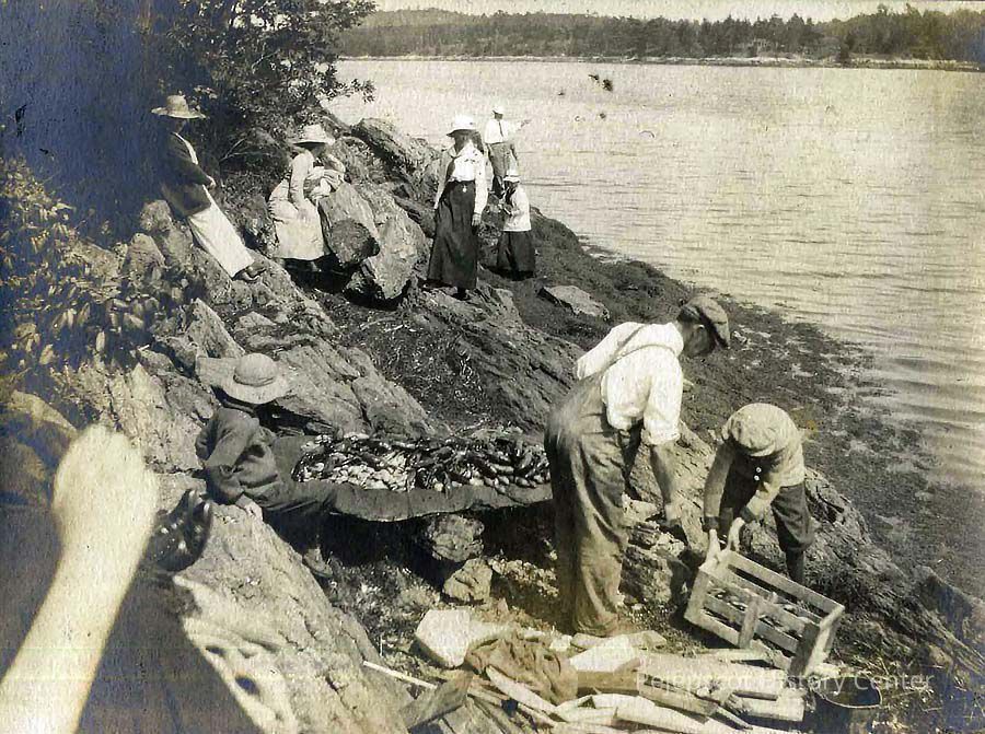 A B/W photograph of people getting ready for a clam bake. Undated