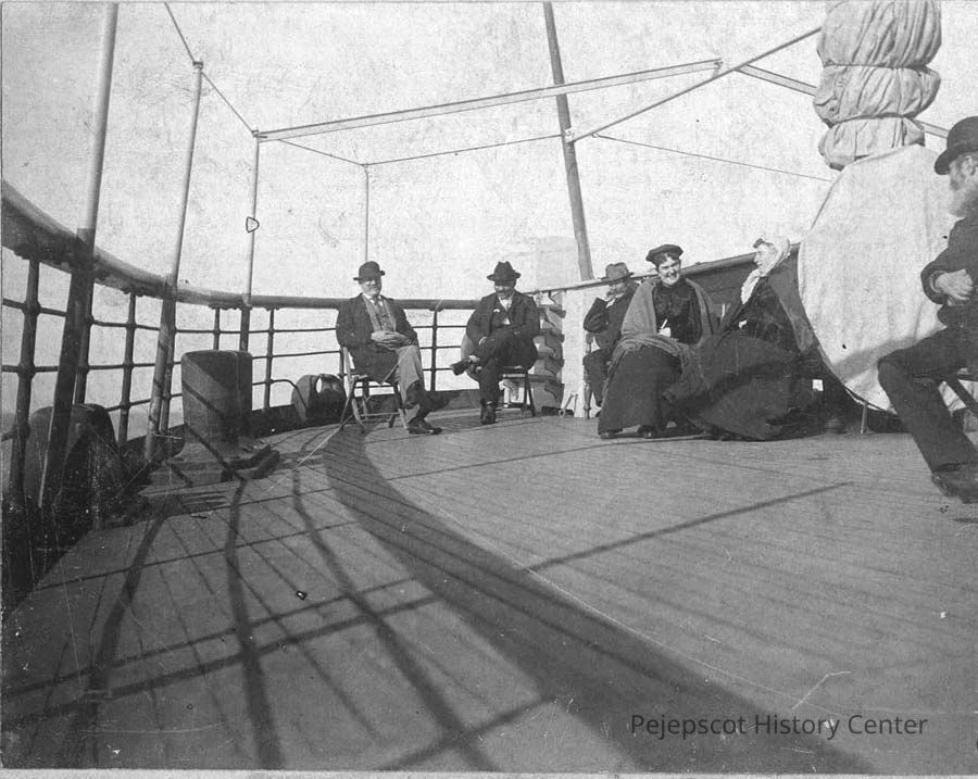 A B/W photograph of 6 people seated on a ship. Probably members of the Skolfield family.