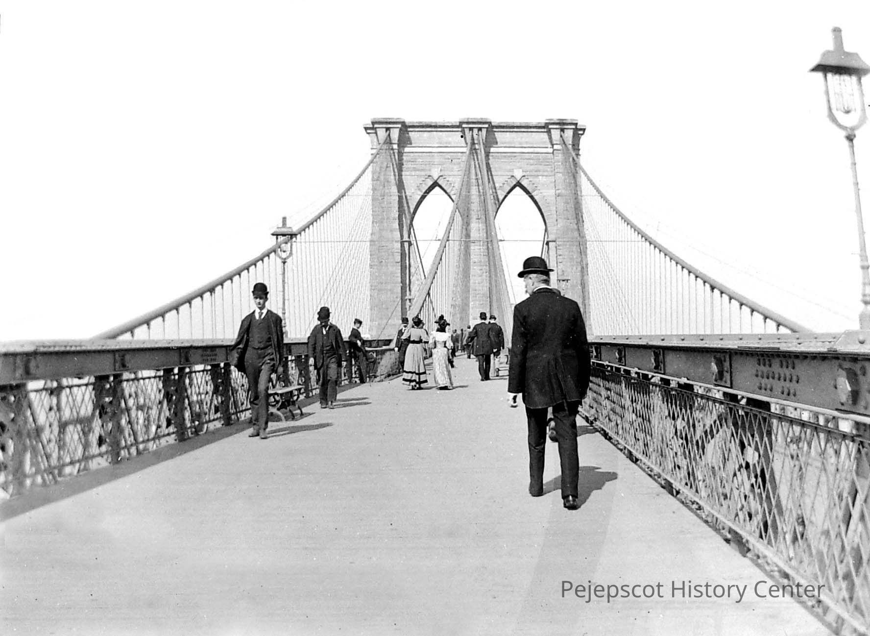 A glass plate negative 044 and with a photograph of people walking across the Brooklyn Bridge, in Brooklyn, NY.