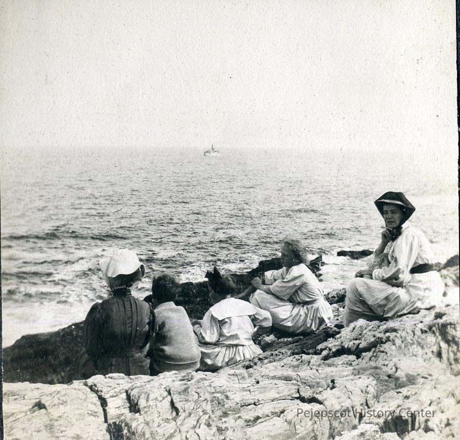 A B/W photograph of people on the rocks at Bailey's Island. Undated