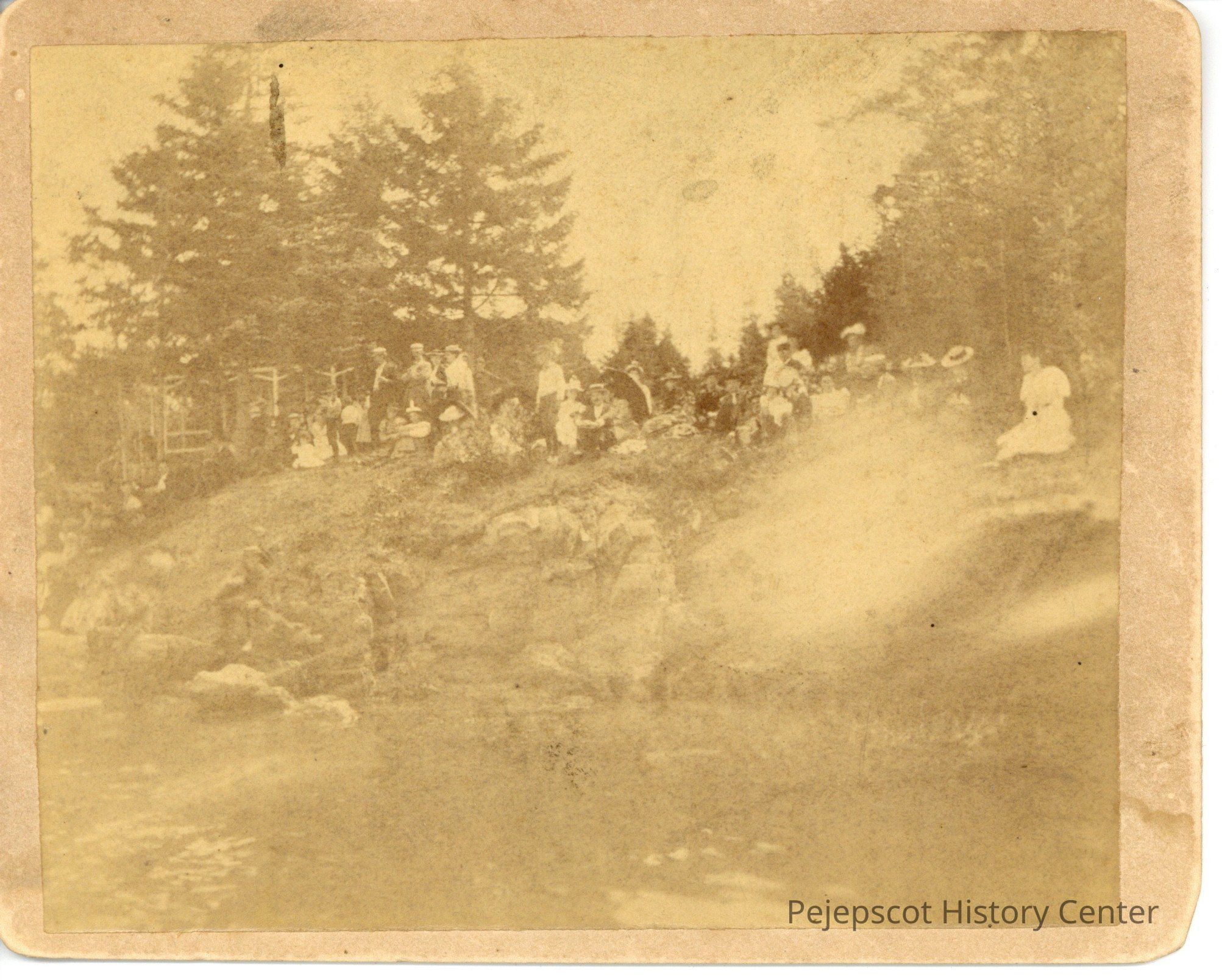 Mounted black and white photograph of people clustered on the shore at Mere Point, in front of what became known as Wells' Cottage. Written on the back in pencil reads "Tub race Alg raced." Alg is Algernon Chandler. The cottage belonged to Charlotte Chandler Wells and was passed on to Richard D. Wells.