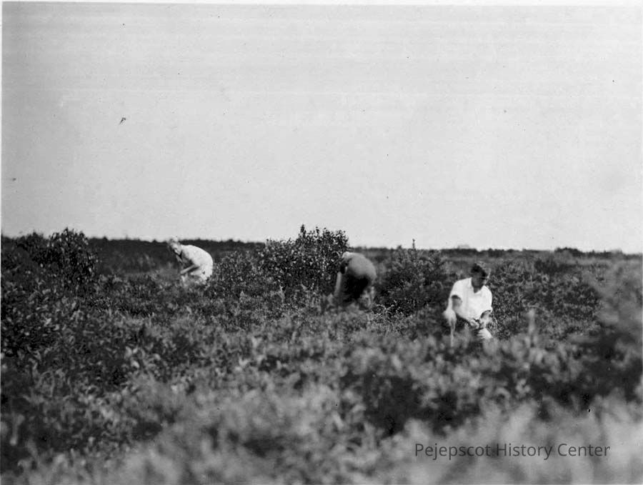 A B/W photograph of people picking blueberries on the Brunswick Plains, now Brunswick Naval Air Station. Undated