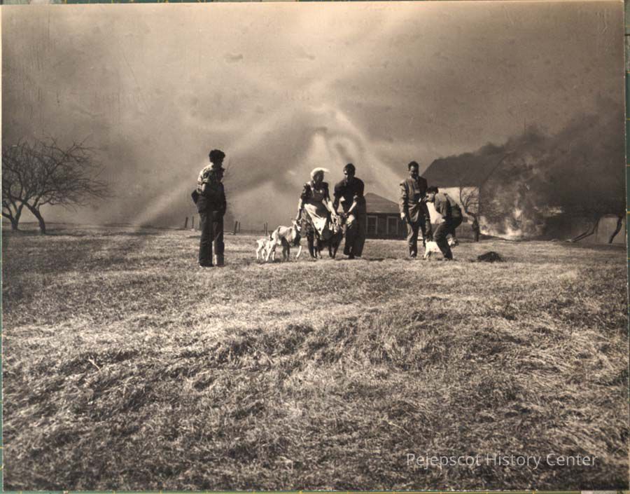 A B/W photograph of family of Mrs. Florma Curtis running from the Hillside to Base Fire. The fire was started by a train at Hillside. It jumped Harpswell Road and ended up on the Base. April 21, 1952.