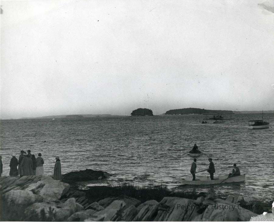 Photo of people watching "Around the World Flyers" Sea Planes, 1924, Mere Point, Brunswick, Maine.