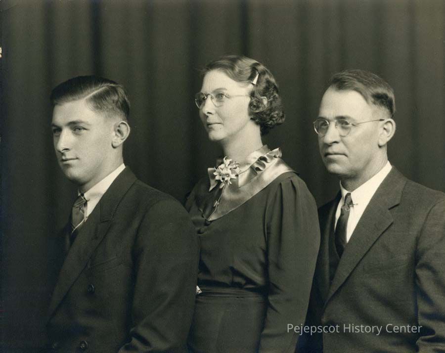 A B/W photograph of Percy Hyde Jr., Blanche Watson Hyde and Percy Hyde Sr. They lived on the Foreside Road in Topsham, Me, taken in late 1930s.