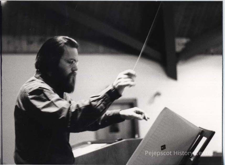 An undated black and white photo of Peter Frewen conducting the Oratorio Chorale. He became music director of the group in 1986 and retired in 2013.