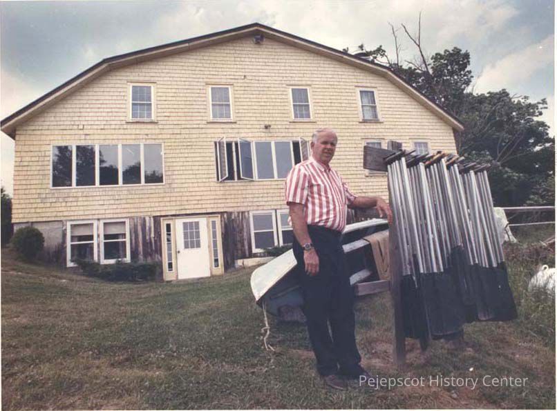 A color photo of Peter Willard standing on the Kennebec River side of the cafeteria building at the Chop Point School & Camp in Woolwich, was published in The Times Record in Brunswick, Maine, on 6/13/1991.