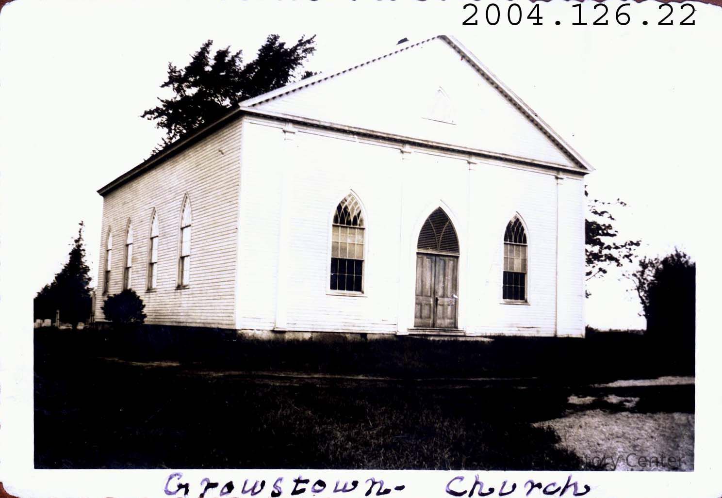 A B/W photograph of the Growstown Church in Brunswick, Maine.