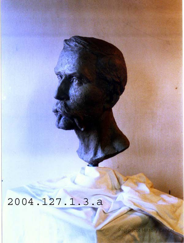 Color photograph of a "life-size portrait," of the J.L. Chamberlain's head done in clay. It is part of a group of 4 color photographs of the model glued to a piece of white paper.