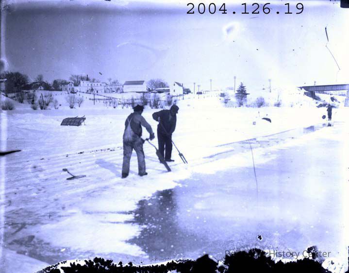 A B/W photograph of two men cutting ice on the Androscoggin River. They are on the Topsham side of the river.