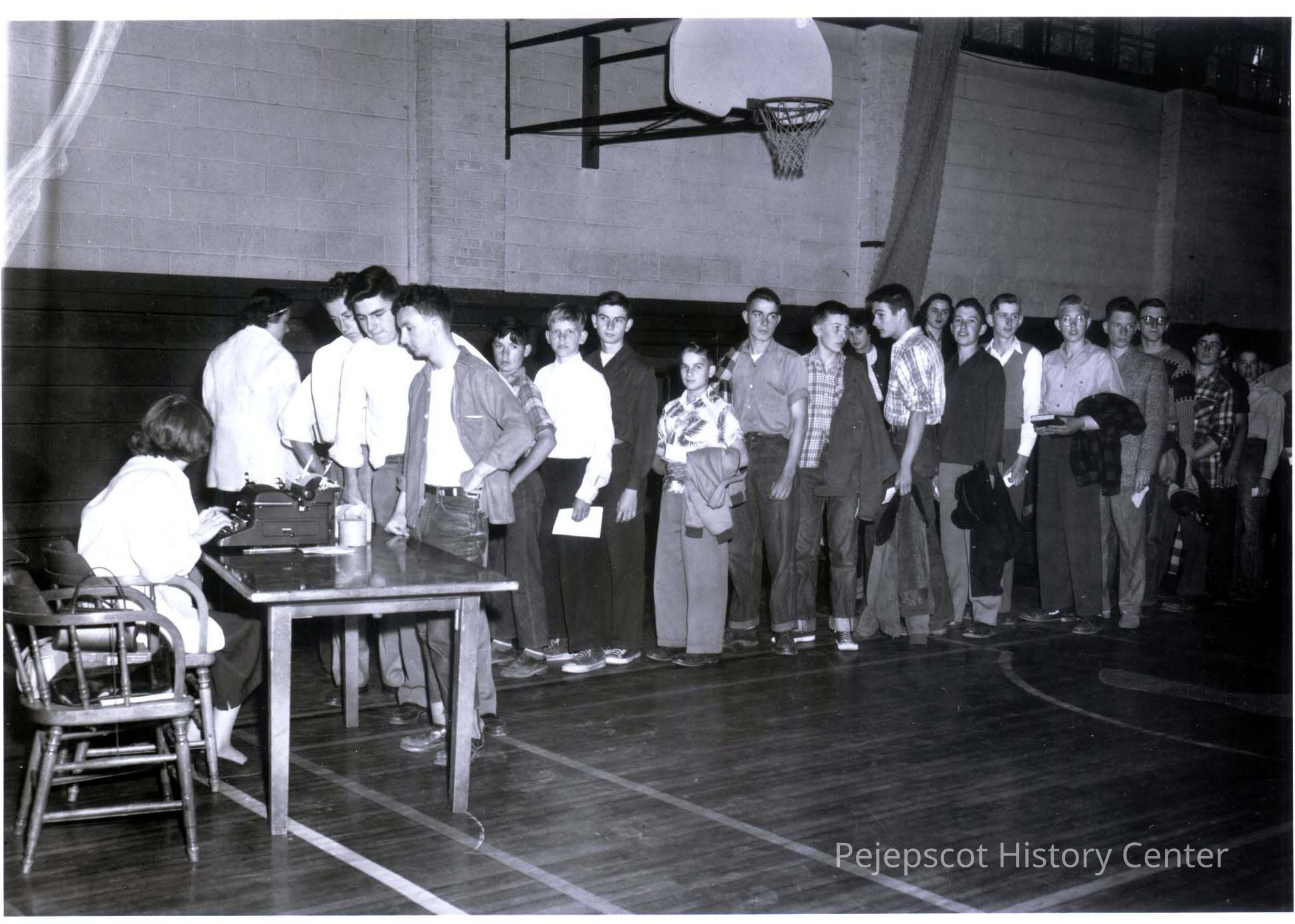 A B/W photograph of a line of men signing up for the draft in a gymnasium. WW II.