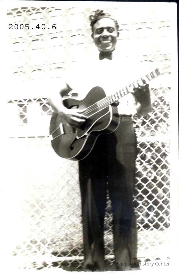 A B/W photograph of Reggie Garrison holding his guitar. July 4, 1939. Brunswick. Verney Mill is in the background.