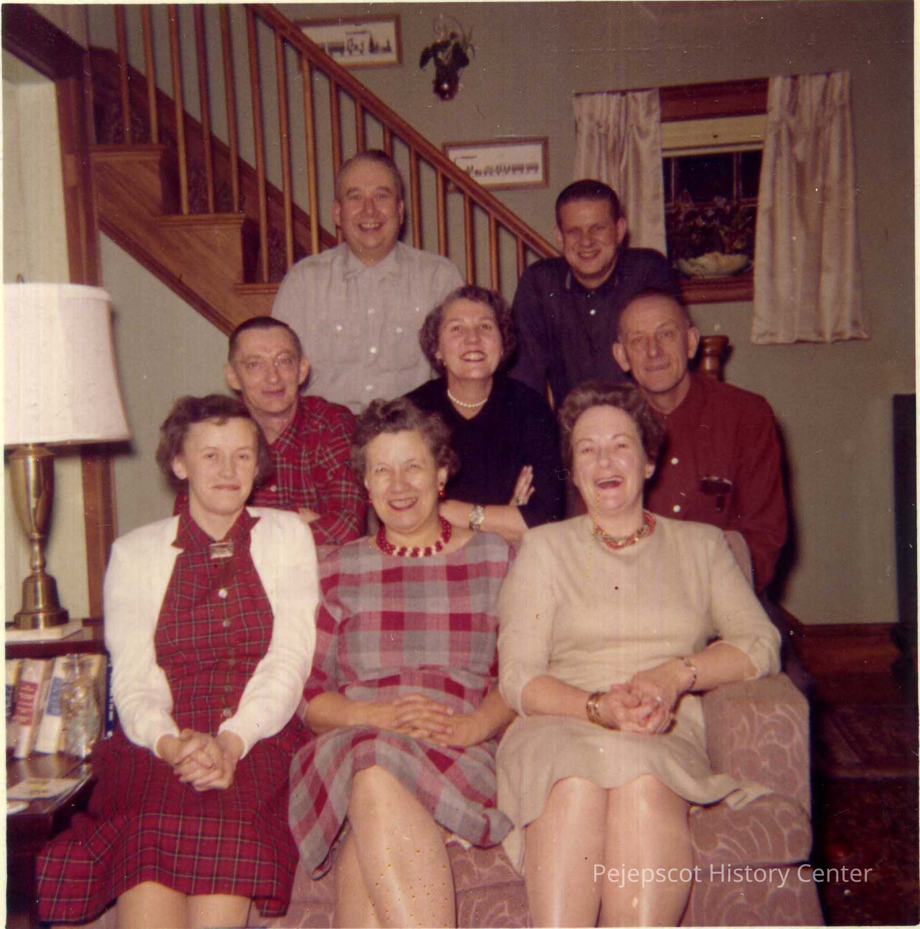 A color photo of 8 people. On the back is marked, Monsurs Abbotts Hills Found in scrapbook 2015.85.1.