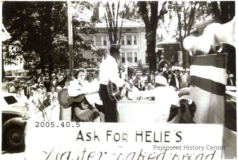 A 4 X 6 B/W photograph of Velma Gaudreau (seated) and Reggie Garrison (standing, playing guitar) on Helie's Bakery Products float in Brunswick's July 4th parade, 1939.