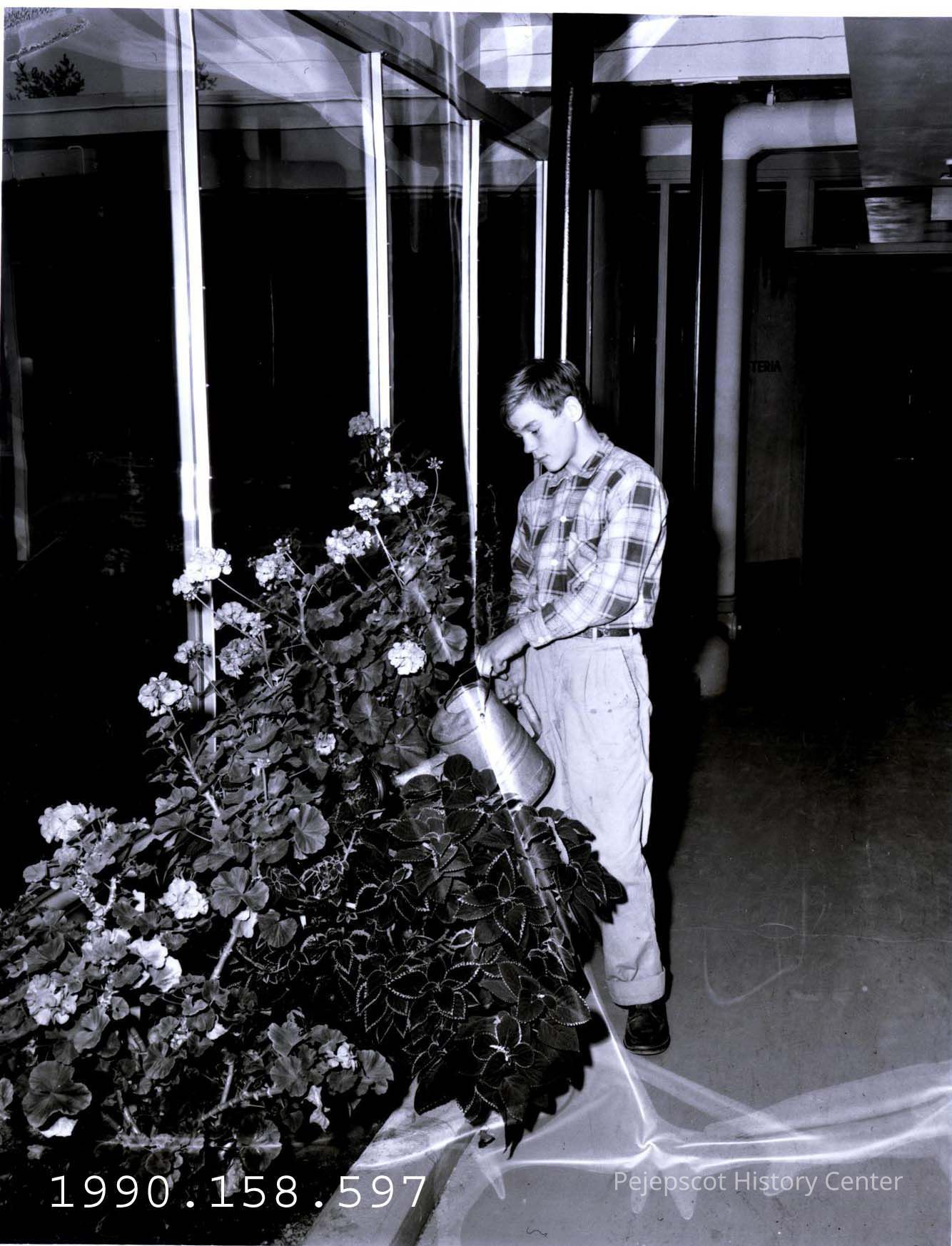 A B/W photograph of Winfield Coombs watering a row of plants in one of the corridors of the new 20-room Coffin School.