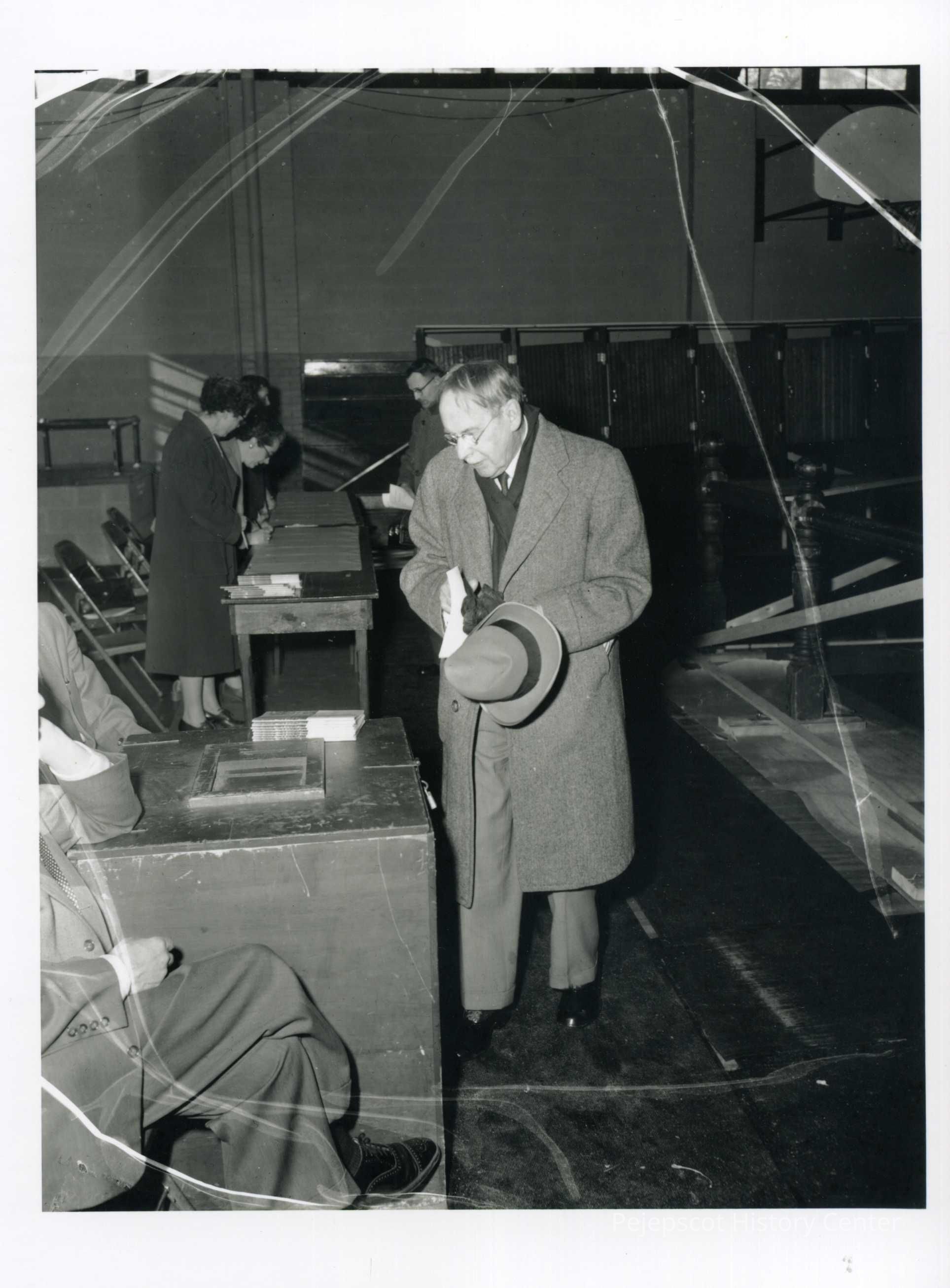 B/W photograph of Dr. Alaric W. Haskell (Dentist) casts his ballot at town election in the old town hall. 03/07/1955
