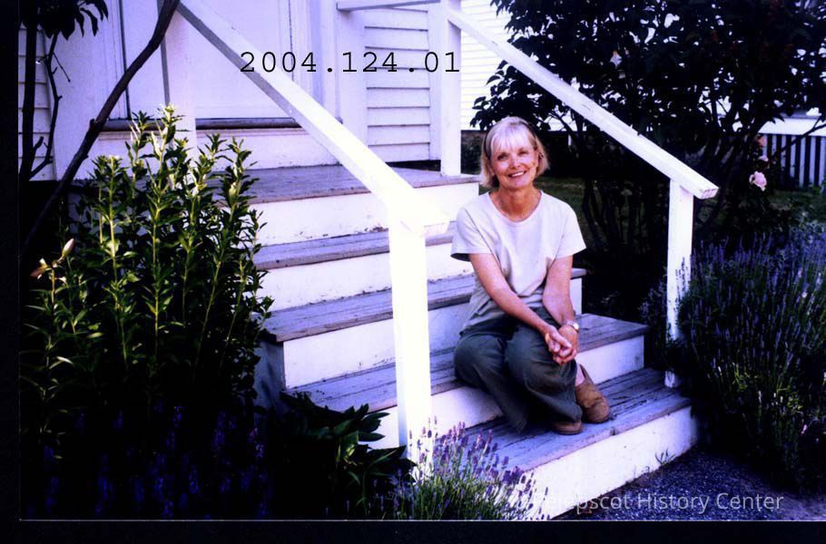 A color photograph of Jeanne Yarborough sitting on her doorstep on School Street.