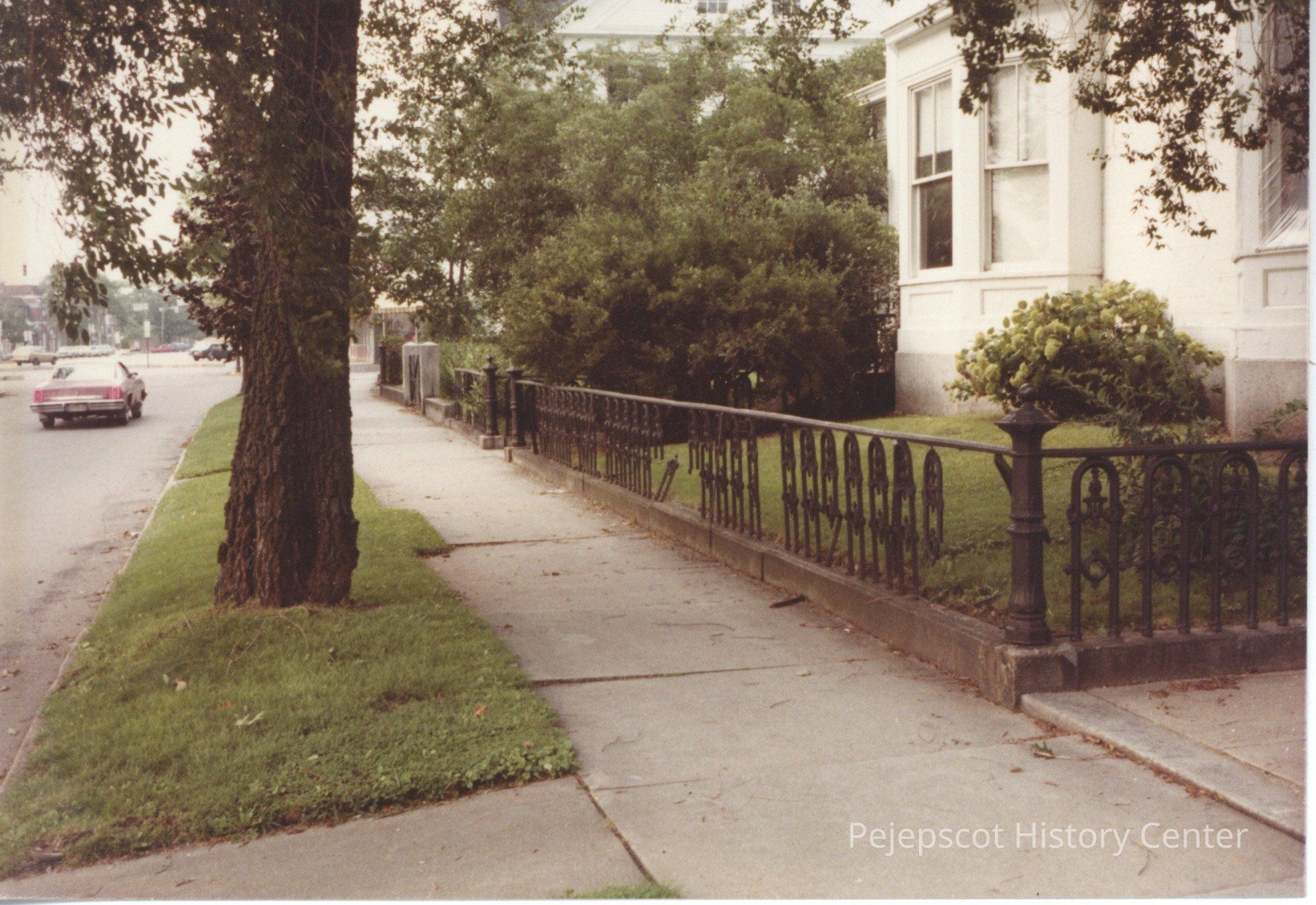 Color photograph of exterior of Skolfield-Whittier House. Fence in front of house is damaged, with pieces missing. Large tree in front of the house. Car driving in road. Stamp on back printed with Sep 81 date.Collection