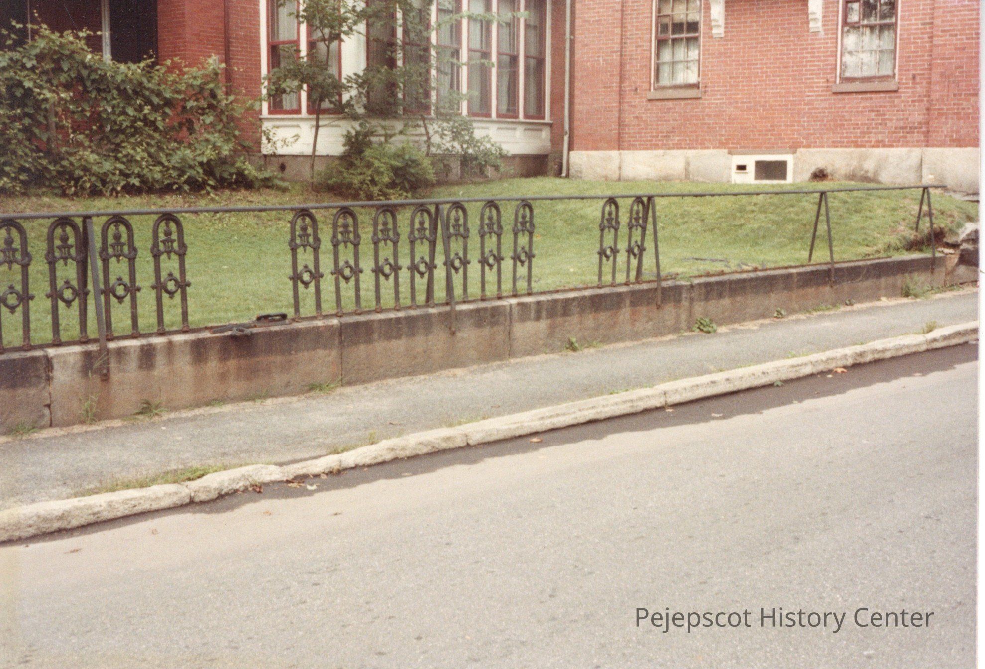 Color photograph of exterior of Skolfield-Whittier House. Fence in front of house is damaged, with pieces missing and some sections falling into yard. Stamp on back printed with Sep 81 date.Collection