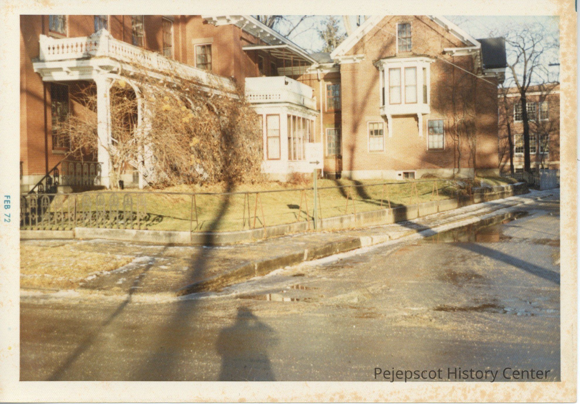 Color photograph of exterior of Skolfield-Whittier House, corner view. Fence in front of house is damaged, with multiple sections missing. Remnants of melted snow on the grass/road. Date of Feb 72 printed on photo border. Photographer's shadow visible on the street.Collection