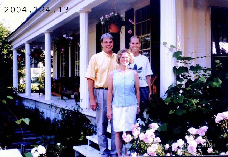 A color photograph of Steve, Mandy and Merril Normand standing at 165 Park Row, Brunswick, ME Bed & Breakfast. They are standing in front of their porch.