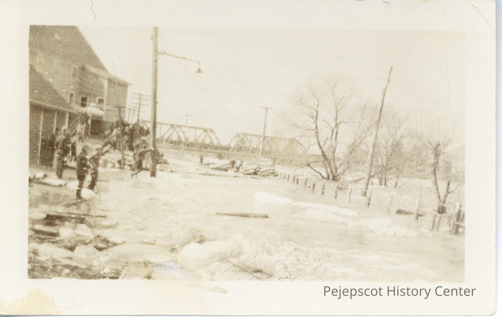 Sepia photograph of flood of 1936, taken from Mill Street, Brunswick. A group of people can be seen in the left middle ground looking at the flood damage. Building in the upper left corner, bridge in the background. White border, 1cm wide around the image.Collection