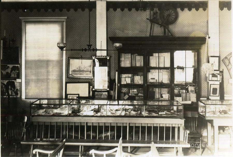 A B/W photograph of a display at the Pejepscot Historical Society on School Street. The long bench in the foreground is now sitting under the portico outside the front door to PHS.