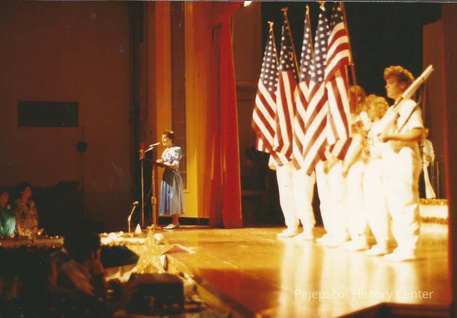A color photograph of Phyllis Gaudreau Glenn introducing herself as Mistress of Ceremony and introducing the National Anthem.
