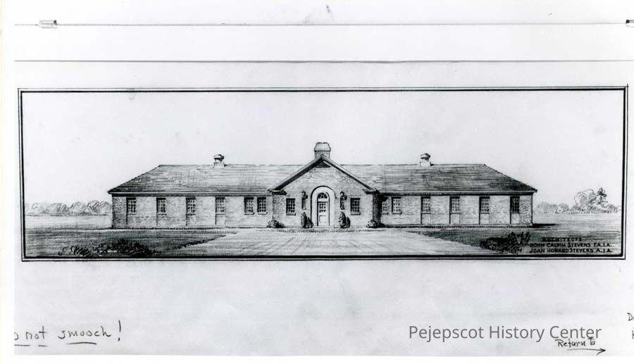 Black & white photograph of a sketch of the Picard Field House at Bowdoin College by John Calvin Stevens, Architect, Portland, ME.