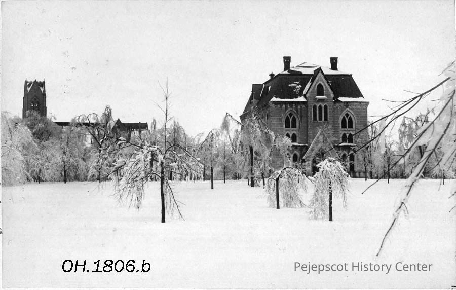 A B/W photograph of Pickard Theatre, Bowdoin College, Brunswick, ME. It is marked "Snow storm April 2, 1887".