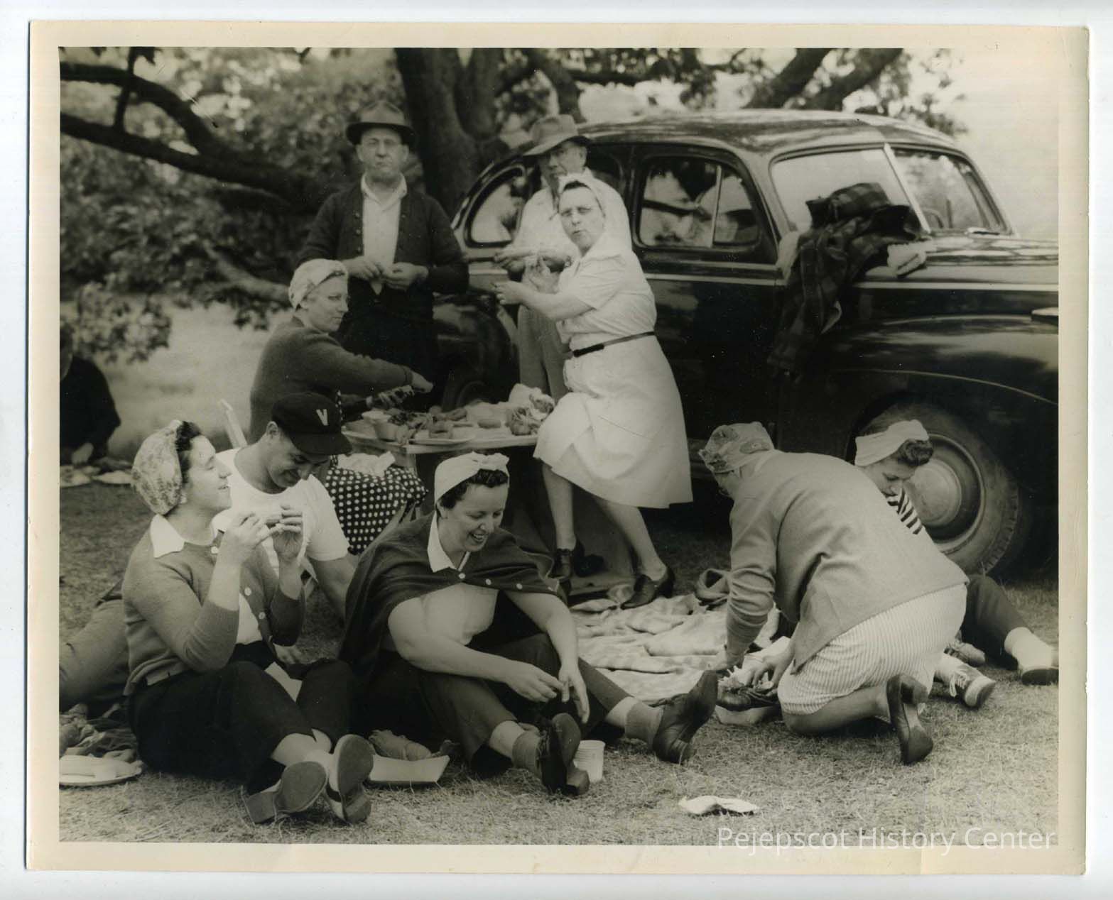 A group of people eating by a car at the Verney Mill employee picnic at Thomas Point Beach. Many of the people are unidentified. In the front row are Jeanne Menard and Lucienne Michaud. At the table is Mrs. Leo Menard in white and at left Leo Menard. Undated