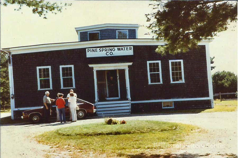 A color picture postcard of the Pine Spring Water Co. building. Mr. Ormsby is on the far left.