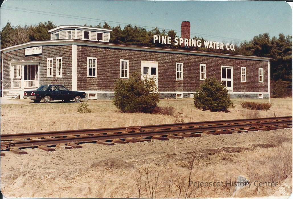 A color photograph of the Pine Spring Water Company bottling plant showing the railroad tracks. Undated