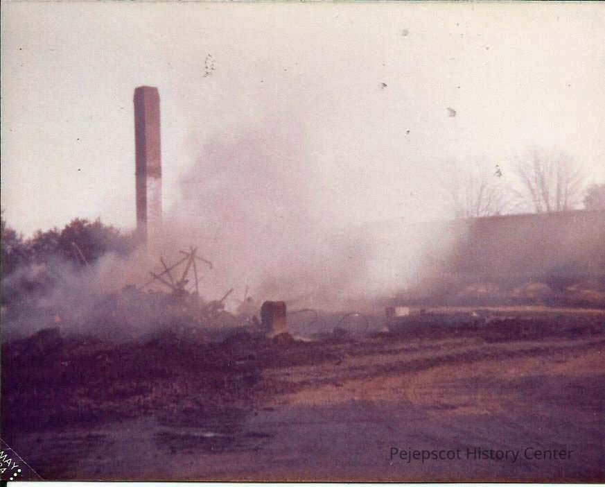 A color photograph of the Pine Spring Water Company building burning. 1/8/1984