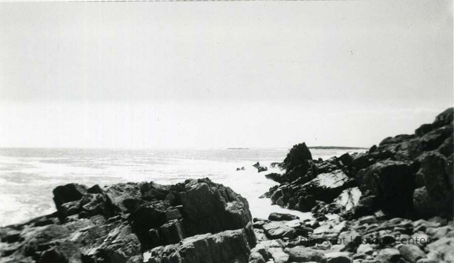 An undated black and white photo of Pinnacle Rock on Bailey Island, Harpswell Maine.