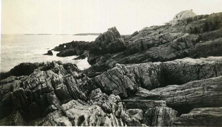 A black and white photo of Pinnacle Rock on Bailey's Island, Harpswell, Maine dated June 25, 1933.