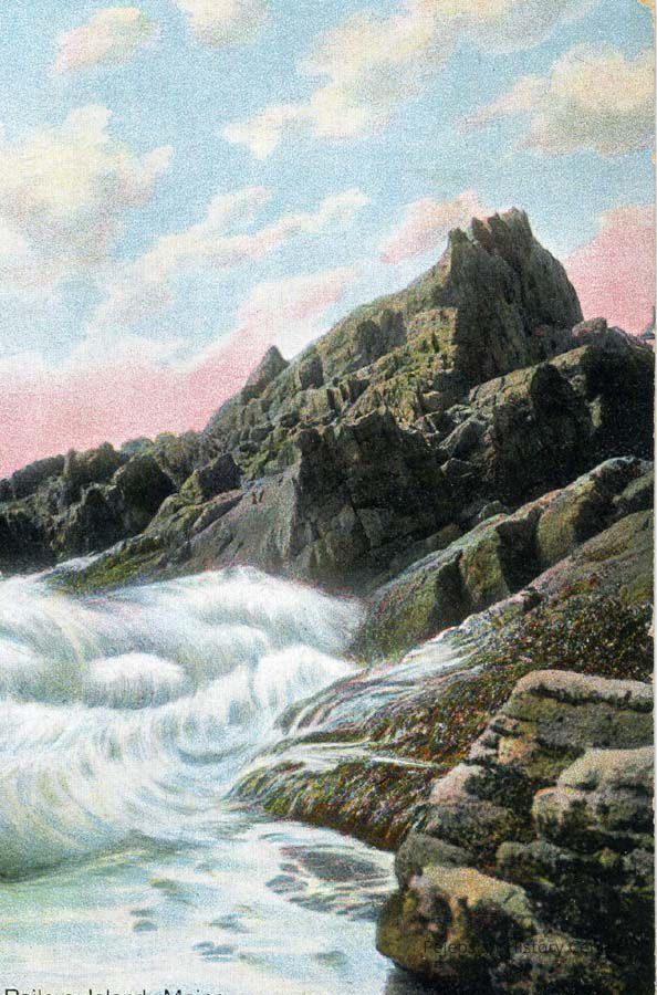 A colored picture postcard of Pinnacle Rock, Baileys Island, Harpswell, Maine. Not dated.Collection