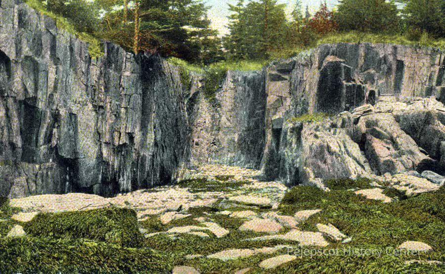 A colorized photograph of Pirate's Cave, Bailey Island.