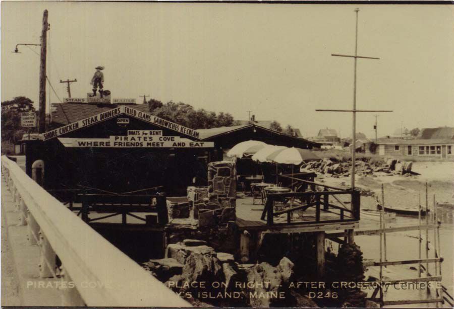 A color print copy of the Pirate's Cove Restaurant. It was built in the 1940s and stood at the end of the Orrs-Bailey Island Bridge (Cribstone Bridge). See back of photo for more info. UndatedCollection