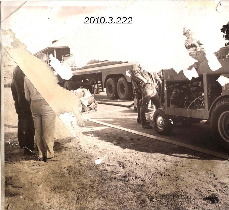 A B/W photograph of placing tape to mark the track for the Tartan Track machine at Bowdoin's Whittier Field. Photo published 9/3/1970. Undated